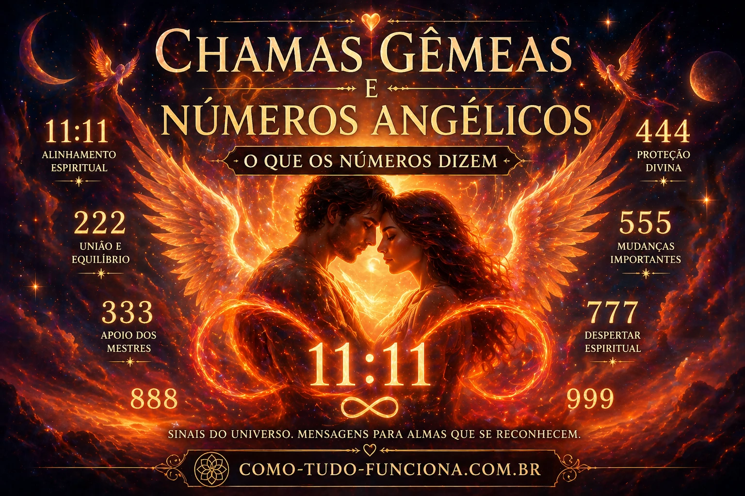 Na tradição numerológica, cada número angélico carrega uma mensagem específica para a jornada das chamas gêmeas — e o número que aparece frequentemente pode ser interpretado como um possível indicativo da fase em que você está — nunca como diagnóstico definitivo. Essas interpretações não têm base científica comprovada e variam entre tradições. Para o contexto completo, veja nosso guia de números angélicos de 000 a 999 e o artigo sobre Numerologia 2026.